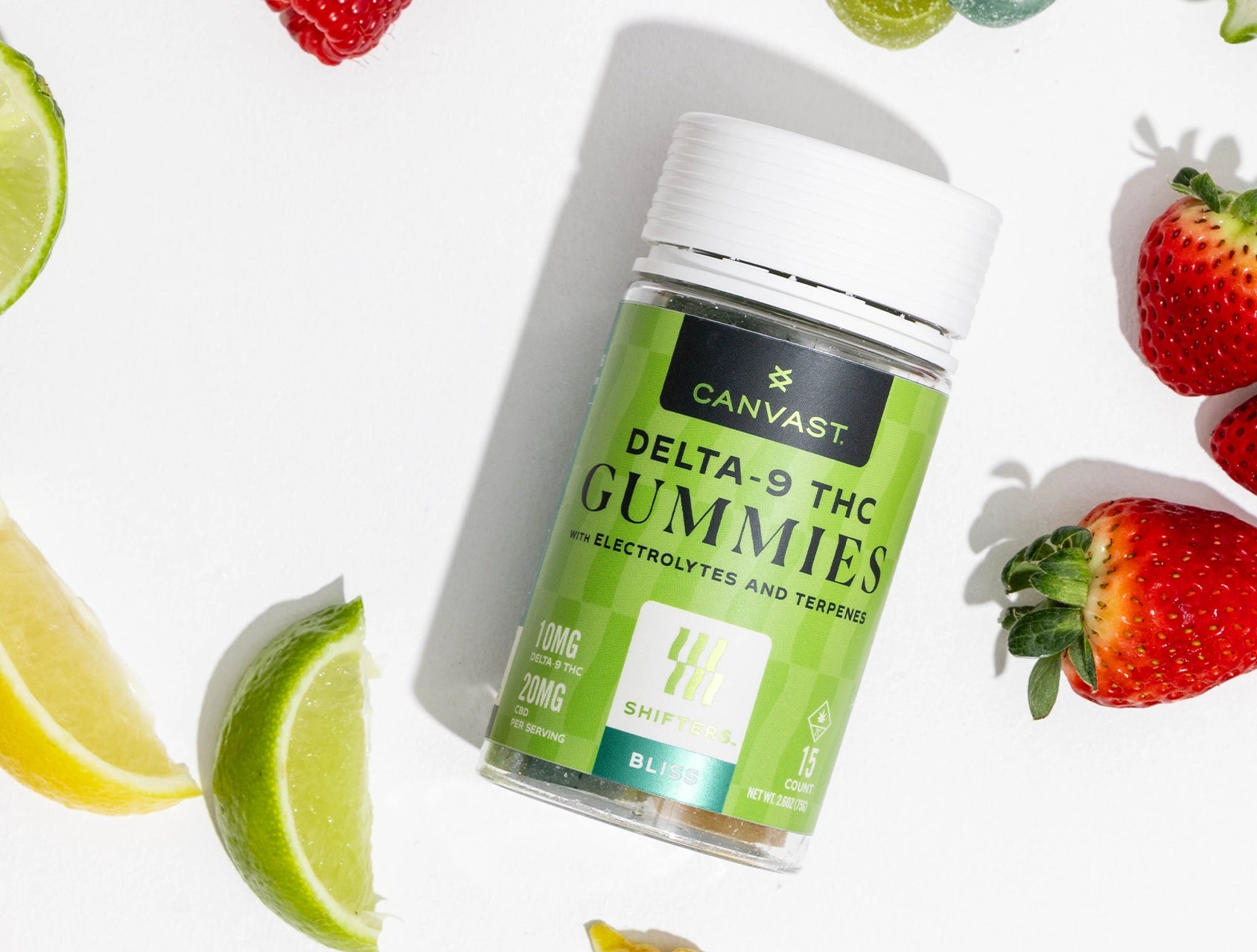 Organic Sugar, Organic Tapioca Syrup, Water, Fruit Pectin, Potassium Gluconate, Organic Flavor, Natural Flavors, CBD Isolate, Hemp Derived Delta 9 THC Distillate, Citric Acid, Sodium Bicarbonate, Vegetable Juice (color), Botanical Terpene Blend